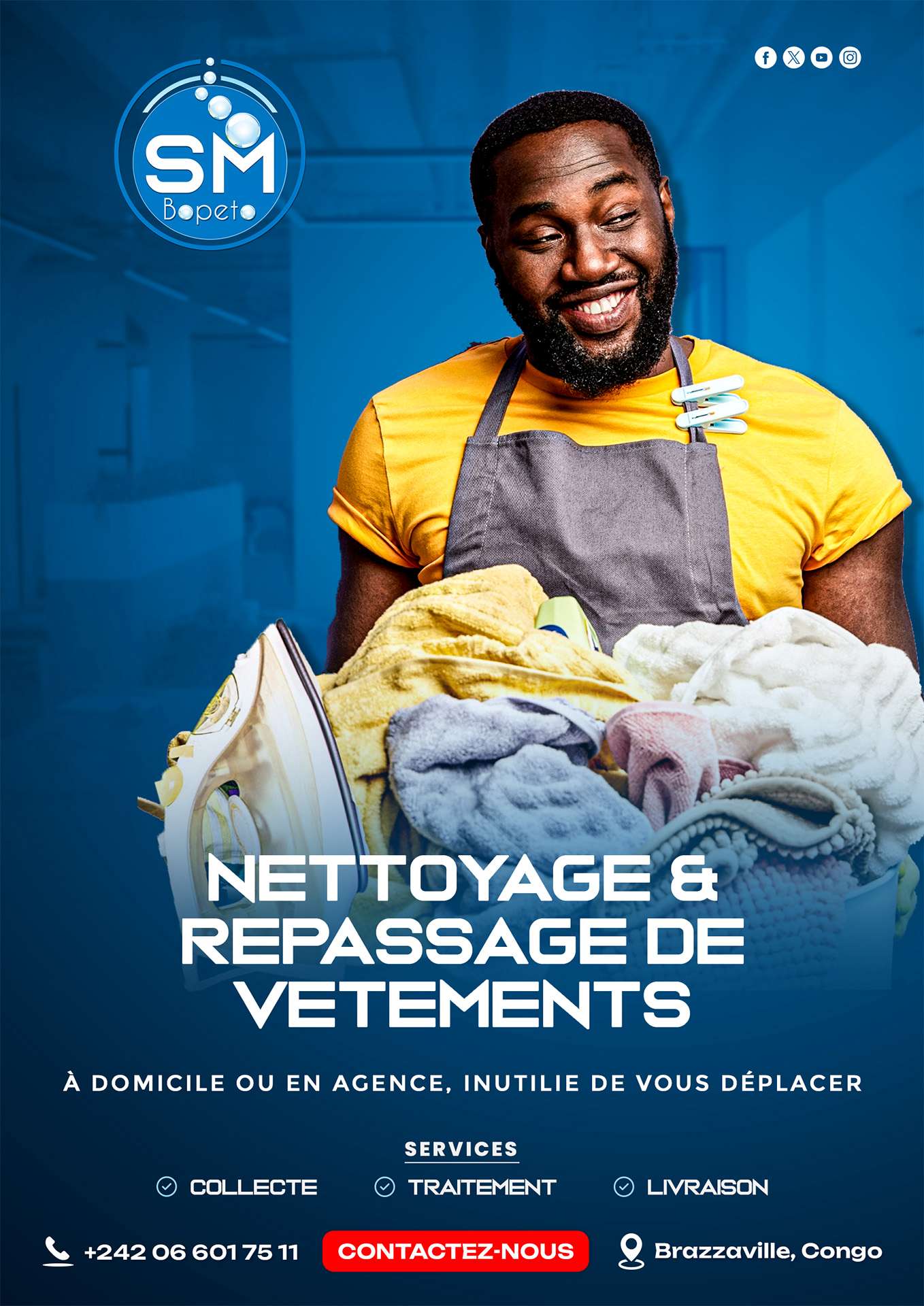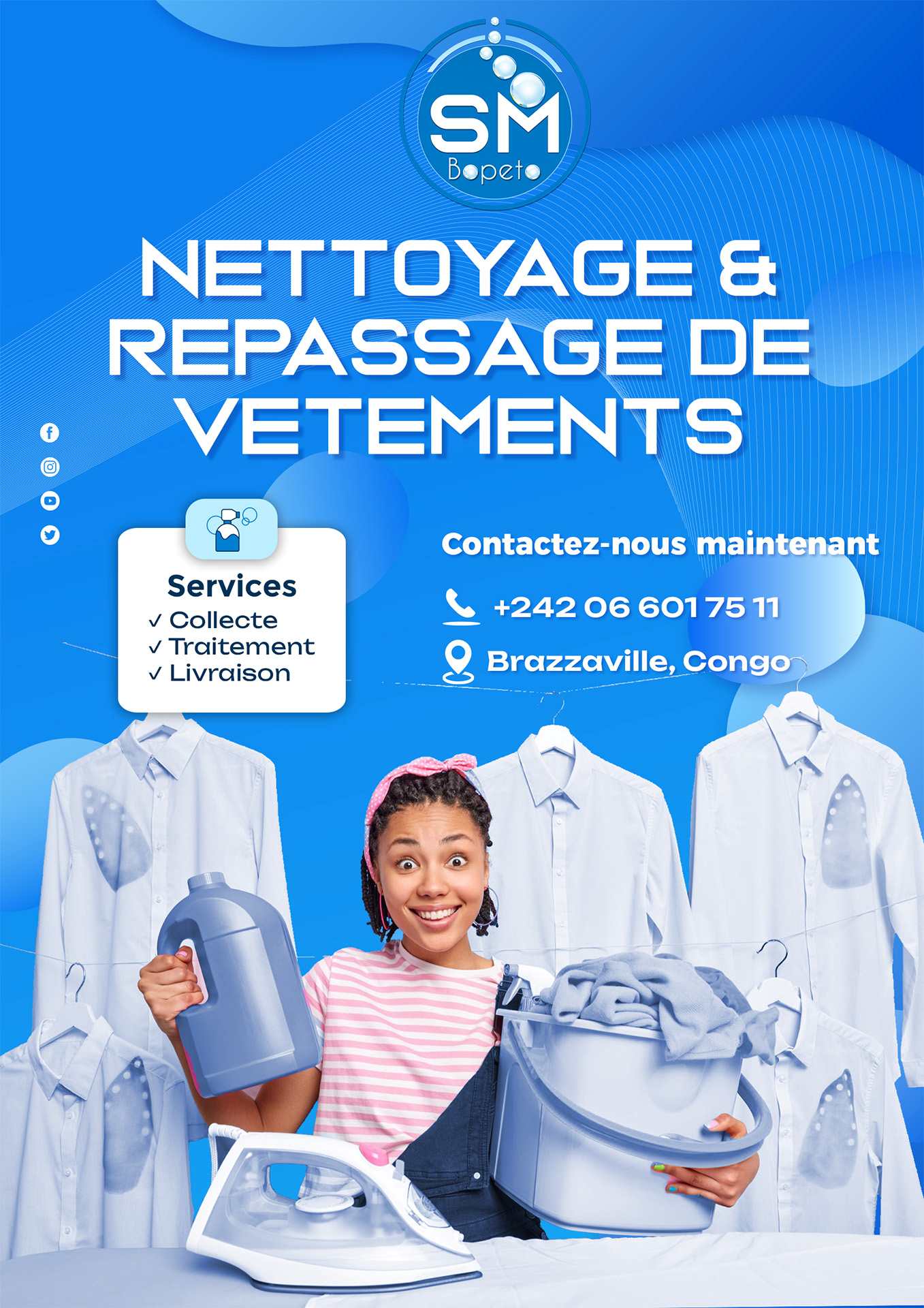 Visuel promouvant le service de nettoyage de vêtements à domicile et en agence SM Bopeto. Présentation des services, coordonnées et zone desservie. Design moderne et attrayant, avec images illustratives, pour une communication visuelle efficace et engageante.