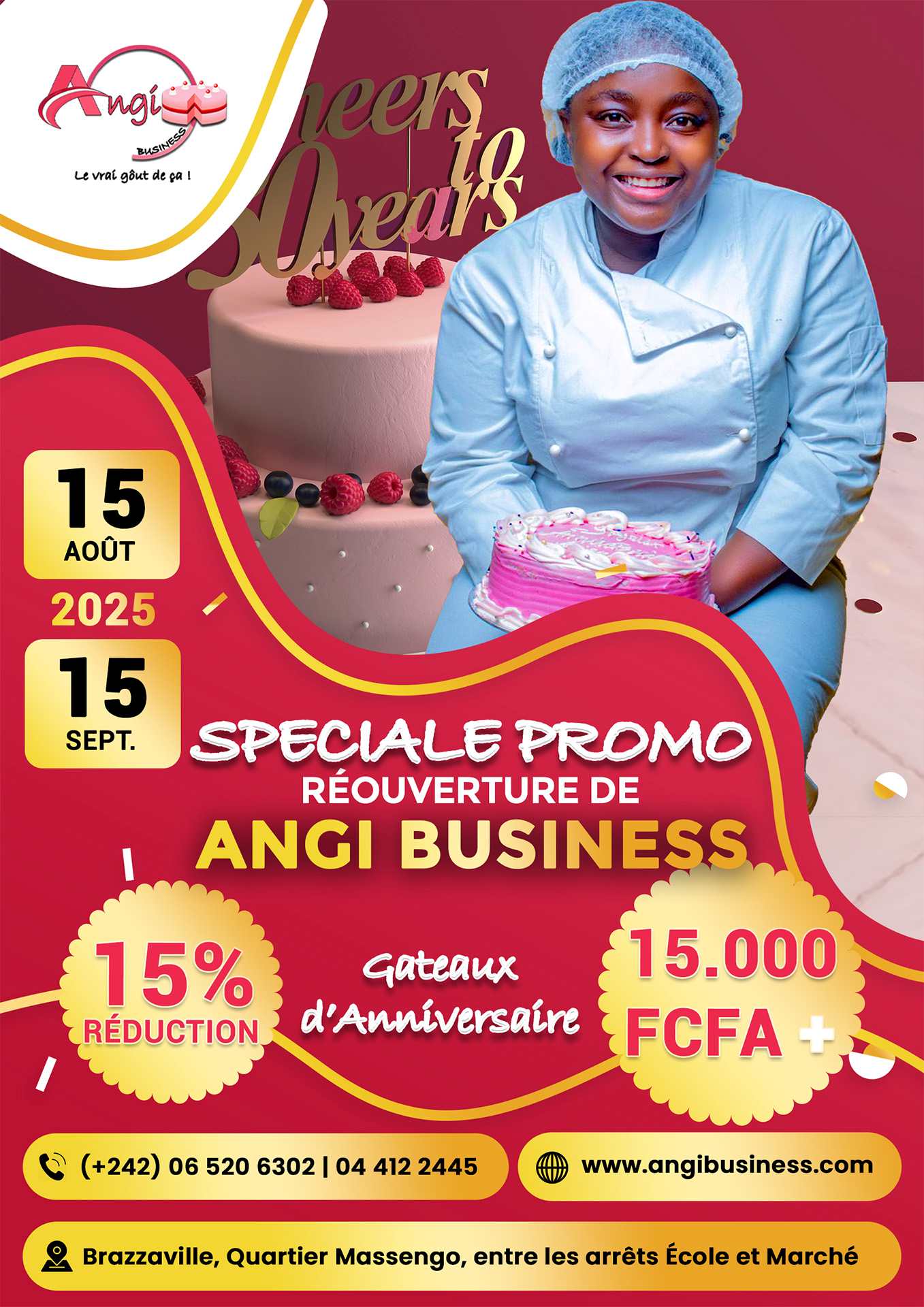 Visuel promotionnel offrant une réduction de 15% sur les gâteaux d’anniversaire d’une valeur supérieure ou égale à 15.000 FCFA, à l’occasion de la réouverture de ANGI Business. Détails de l’offre, coordonnées et localisation. Design élégant, moderne et attrayant, pour maximiser l’impact visuel et la conversion.