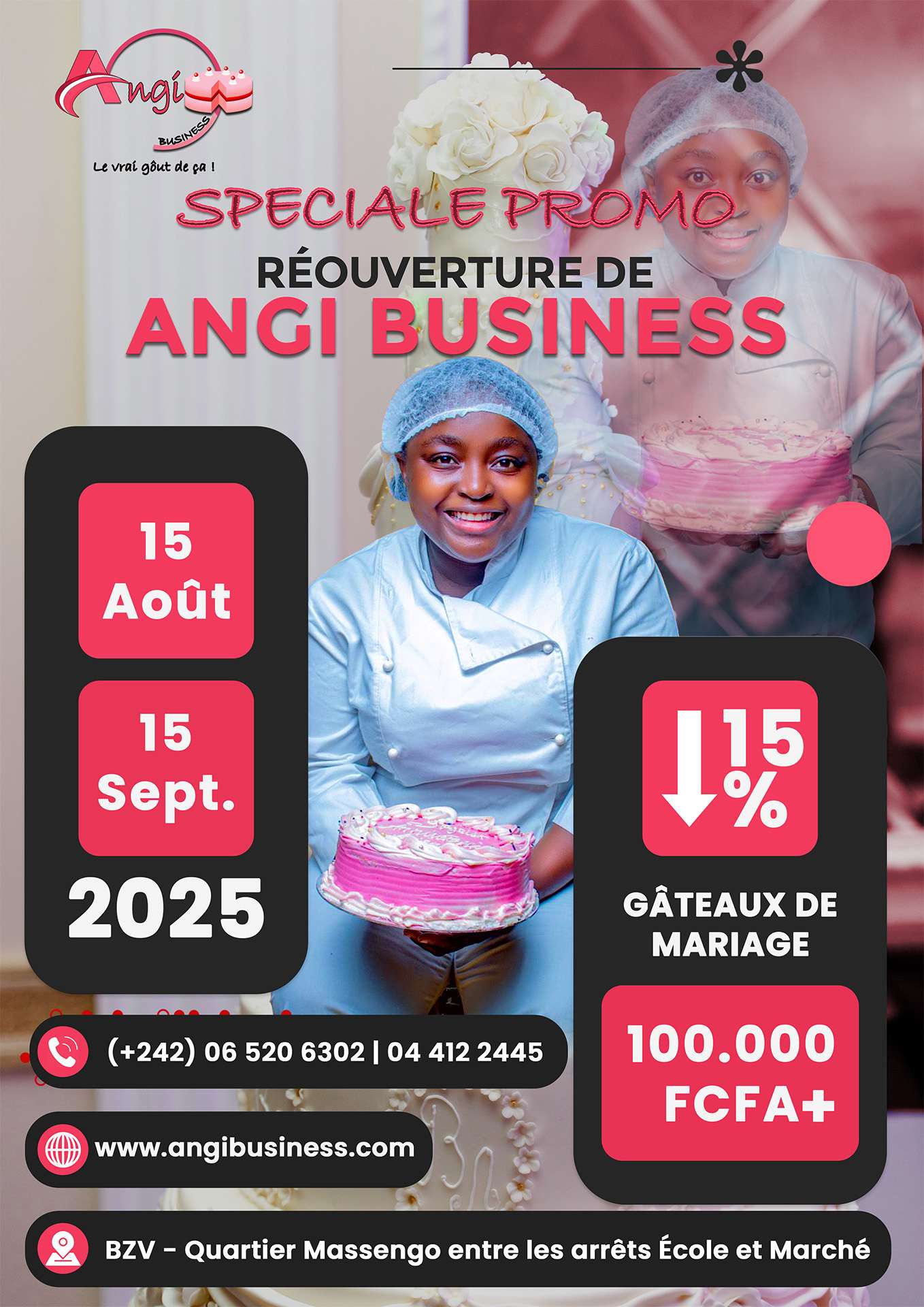 Visuel promotionnel offrant une réduction de 15% sur les gâteaux de mariage d’une valeur supérieure ou égale à 100.000 FCFA, à l’occasion de la réouverture de ANGI Business. Détails de l’offre, coordonnées et localisation. Design élégant, moderne et attrayant, pour une communication efficace et engageante.