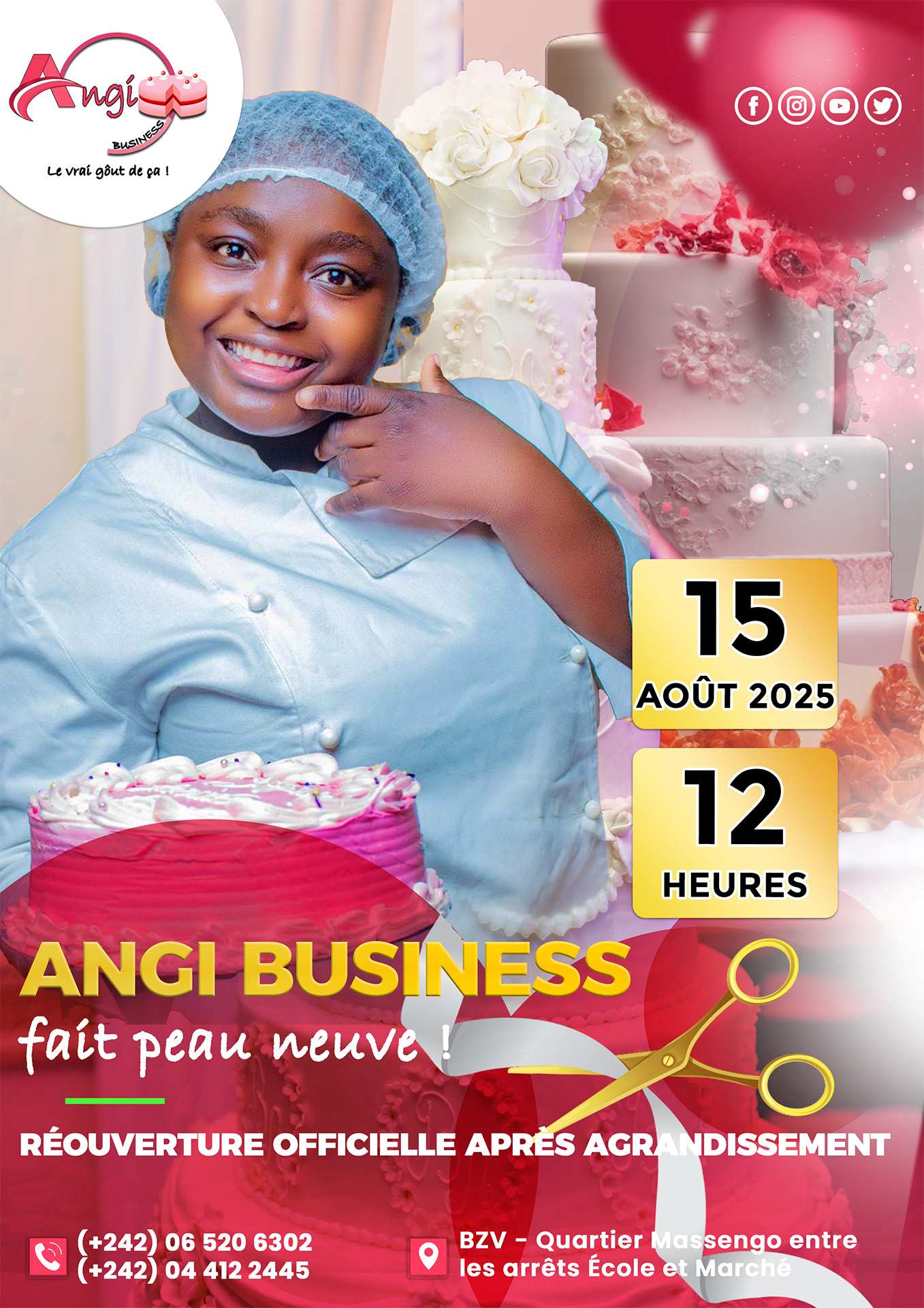 Visuel annonçant la réouverture officielle de ANGI Business après travaux d’agrandissement et de rénovation. Mise en avant de la date, heure, coordonnées et localisation. Design élégant, moderne et attrayant, pour une communication visuelle claire et professionnelle.