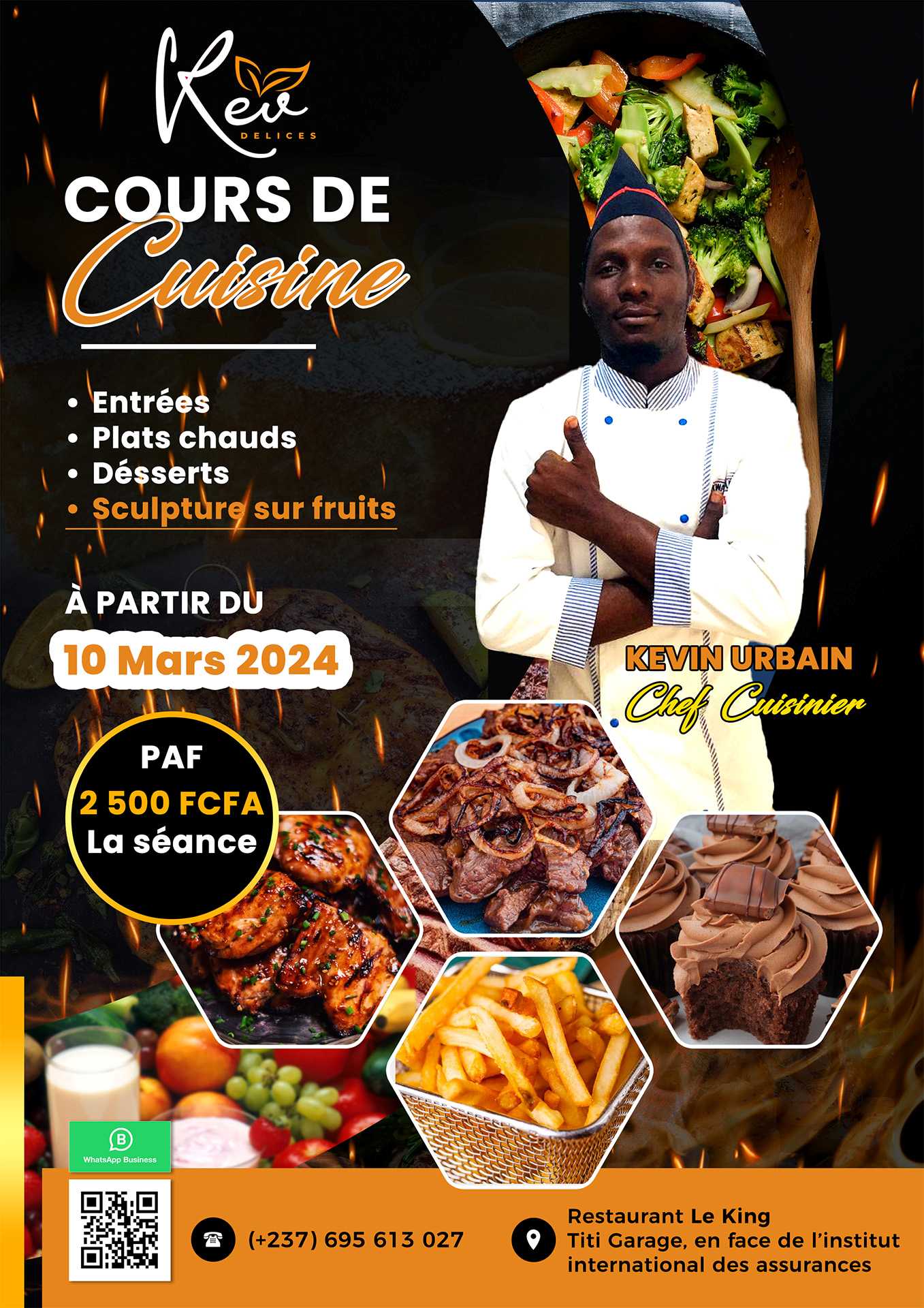 Visuel annonçant les cours de cuisine animés par Kev Délice. Détails des éléments à apprendre, coût par séance, coordonnées et localisation. Design moderne et attrayant, accompagné d’images illustratives, pour une communication visuelle efficace et engageante.