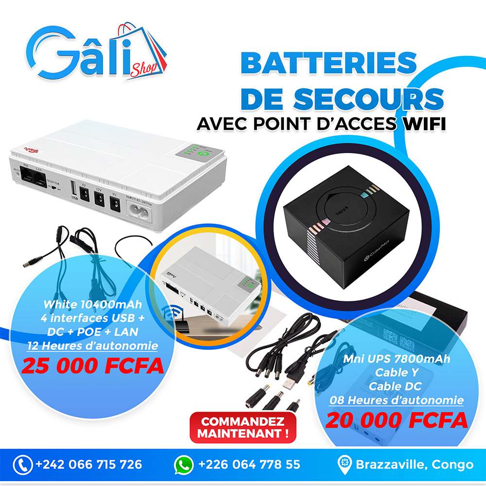 Visuel promotionnel mettant en avant la vente de batteries de secours à point d’accès wifi. Détails techniques, images illustratives et coordonnées. Design simple et moderne, pour une communication visuelle efficace et professionnelle.