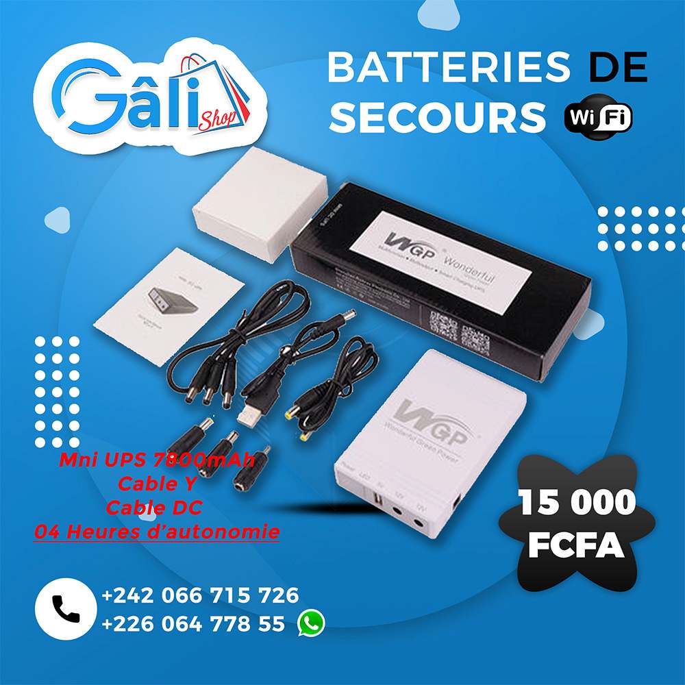 Visuel promotionnel pour la vente de batteries de secours à point d’accès wifi. Présentation des caractéristiques techniques, images illustratives et coordonnées. Design simple et moderne, pour une communication claire et professionnelle.